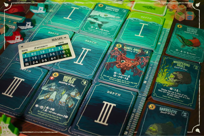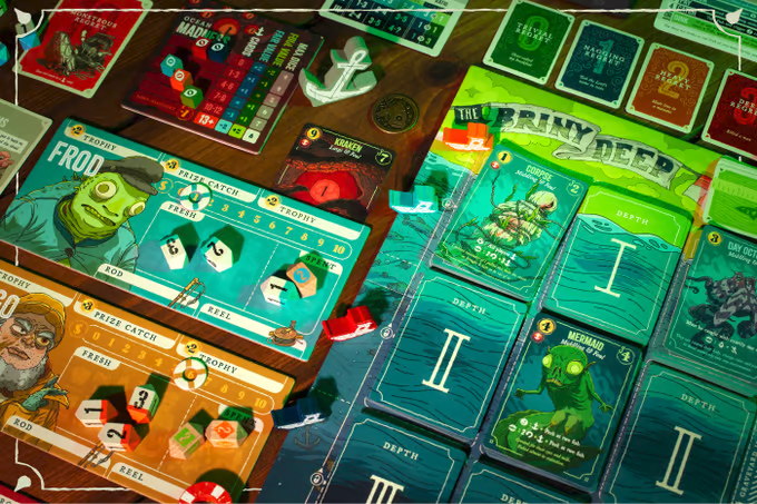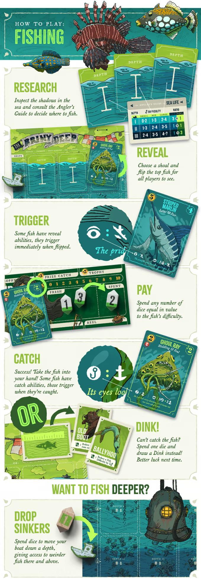 Survey the sizes of shadows on the backs of 9 different fish shoals at three depths, determining what you think you can afford to catch and if you want to risk it for a potentially better reward. Flip fish, spend dice, add them to your collection - but beware of reveal and catch abilities that can have various effects on the game!