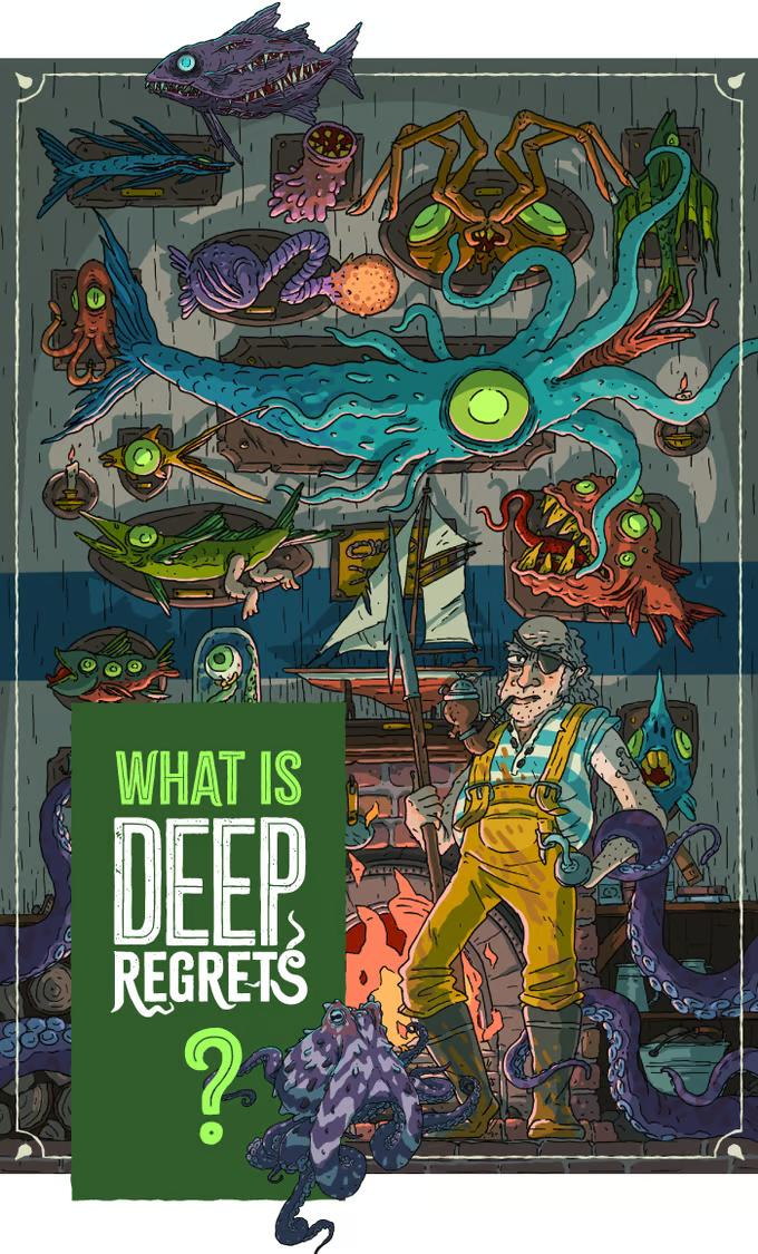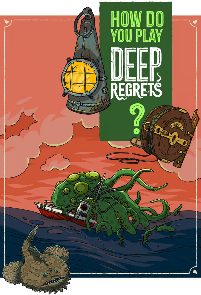 In Deep Regrets, you'll spend a week moving between sea and port, trying to pull in the most desirable creel of fish and fish-adjacent creatures. You'll need to manage your energy, resources, and regrets and push your luck to pull in the best haul possible. At the end of the game, you'll score the fish you have in hand, the fish you've mounted, and any Fishbucks you have remaining... and the player with the most regrets will lose their most valuable fish.