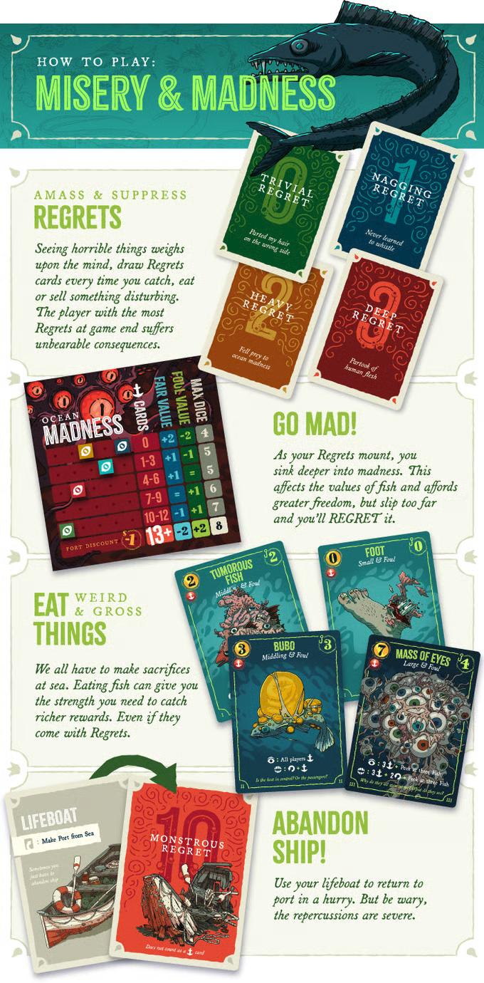 As your eyes spy more and more horrifying things, you'll collect Regrets cards - which drive up your madness but also give you access to more dice and increase the value of weirder fish. It's a risk/reward scenario as you balance your madness, knowing that at the end of the game the player with the highest value of Regrets will have to discard their most valuable mounted fish.