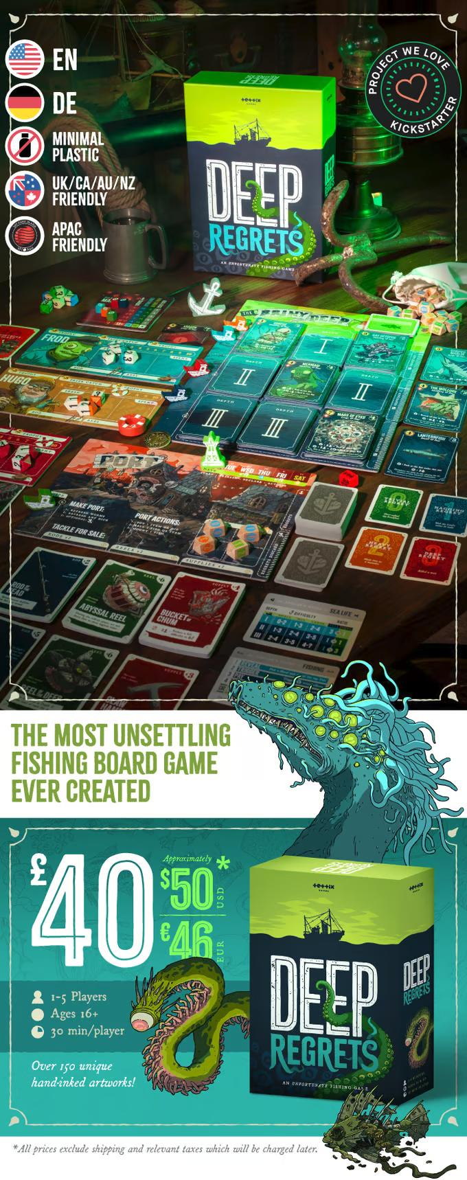 Deep Regrets is a strategic horror fishing game for 1-5 players, aged 16 and up, running about 30 minutes per player. Decide what to eat, what to sell, what to mount, and how many regrets you're willing to carry as you push yourself too far and spiral toward madness and a thrilling victory at sea… or an untimely end to your career.