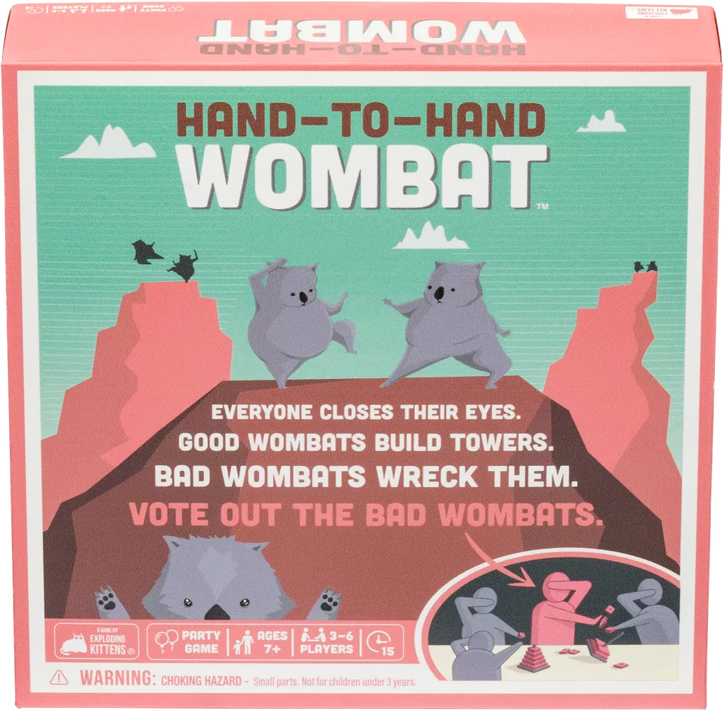 To play Hand-to-Hand Wombat, you’re each given a secret identity as a Good Wombat or a Bad Wombat, then everyone closes their eyes. Good wombats build towers; Bad Wombats try to mess with those towers. After the timer is up, everyone opens their eyes and discusses, argues, and votes on who they think is a Bad Wombat.