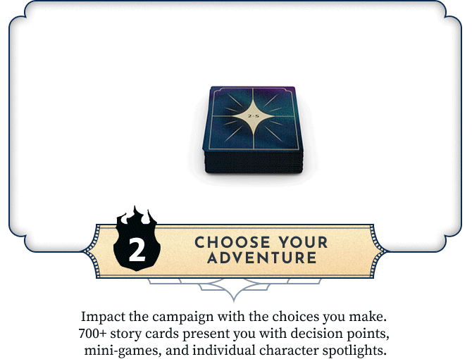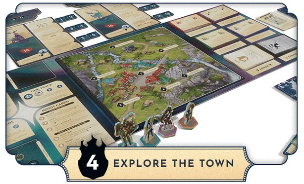 Each quest has three phases: adventuring, battle, and exploration. In the adventuring phase, players make choices based on options presented on the quest cards and need to accomplish something (such as crossing a river or chasing down a suspect) by flipping the correct number and color of cards from their decks. In the battle phase, players work together to defeat enemies on a physical battle map. Turns are determined by drawing chits out of the destiny bag, with each enemy having numbered tokens that correspond with different attacks and actions. Players may play action cards on their own turns to do damage and can play boost cards on other players' turns to do things like reduce damage, move players, or even return a drawn chit to the destiny bag for redraw. The game doesn't end if an objective isn't achieved or an enemy defeats the heroes, but it will affect later gameplay and choice options. Lastly, on certain quests players can return to the city in the exploration phase to speak to NPCs, purchase items, and level up their decks.