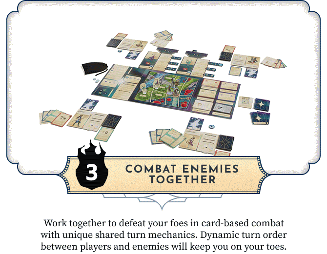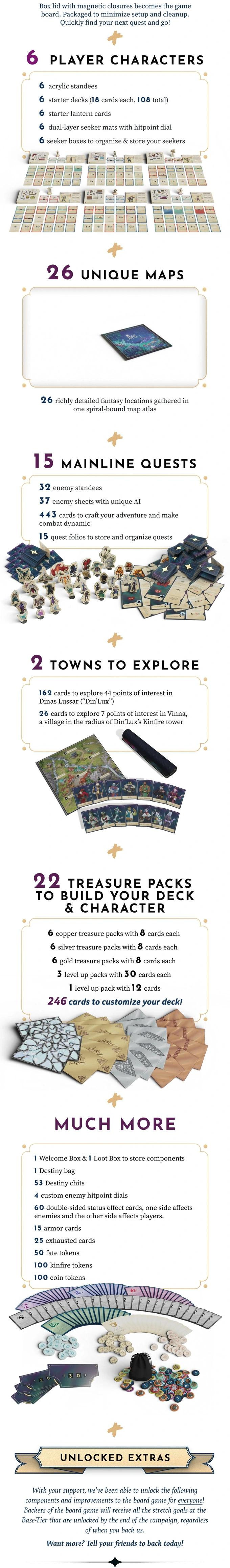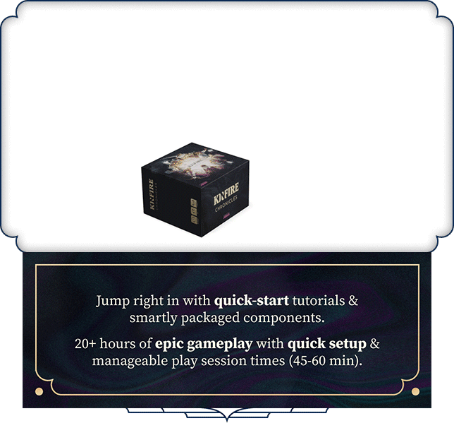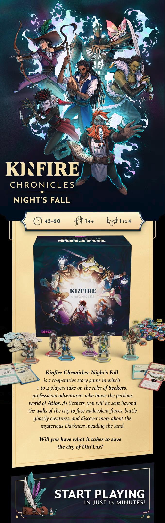 Kinfire Chronicles: Night's Fall is a co-operative campaign game for 1-4 players that blends thrilling fantasy adventure with tactical, edge-of-your-seat combat. Play as one of six unique Seekers, sworn to protect the city of Din’Lux and help rebuild the world beyond. Armed with kinfire lanterns, you’ll brave the Starless Nights, battle the creatures that emerge, and guard each others’ backs against the malevolent forces trying to stop you.