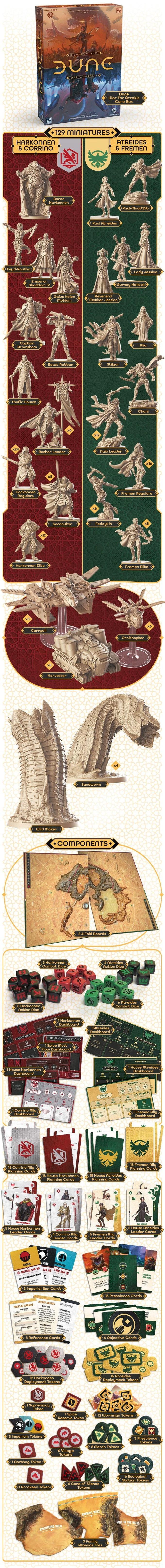 From the designers of the War of the Ring board game comes the thematic strategy board game Dune: War for Arrakis. Centered around the Desert War events from the acclaimed Dune novel by Frank Herbert, this universe and its iconic characters are brought to life for the first time with a myriad of amazing miniatures. The devious House Harkonnen, with the backing of imperial House Corrino, must battle the remnants of House Atreides, who are allied with the desert Fremen, for control of Arrakis and its most precious resource: the spice melange.