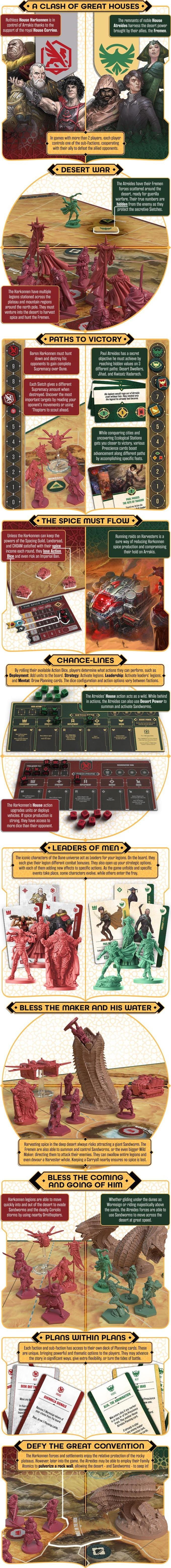 In this asymmetrical strategy game, players fight for control of the planet, maneuvering troops like the Fremen, the Fedaykin, and the fearsome Sardaukar, while sending Spice harvesters into the deep desert, daring to challenge the great Sandworms. The game features an action dice system with numerous event cards that will enable players to retell the Dune saga differently with each playthrough.