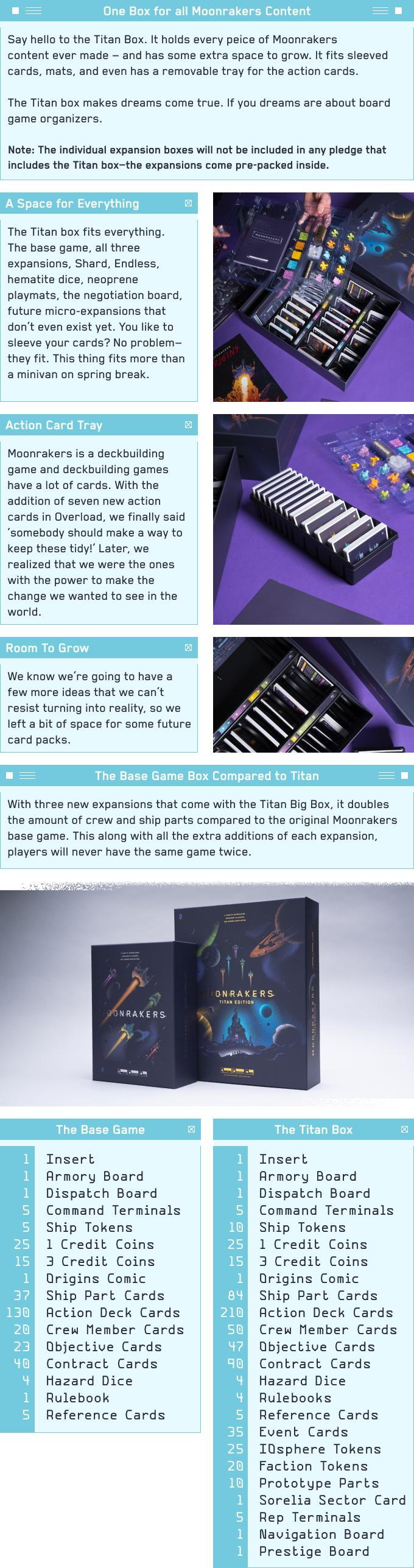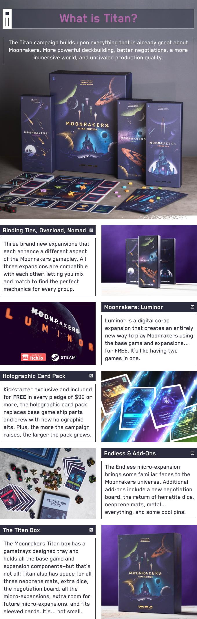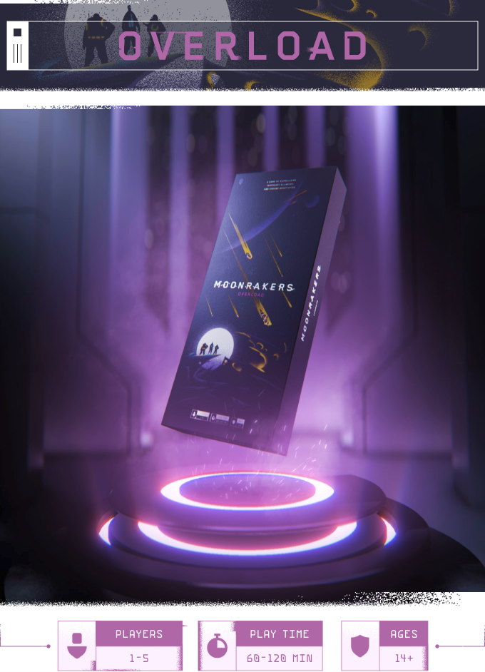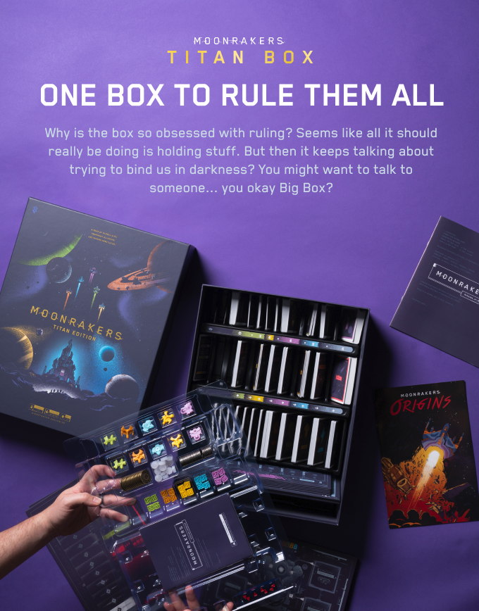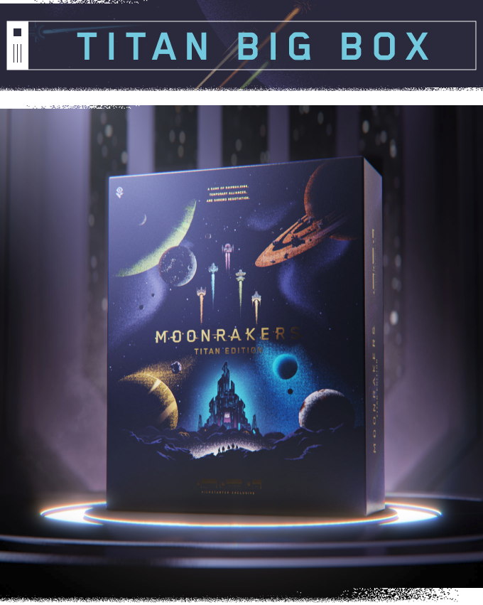 The Moonrakers Titan big box with Moonrakers: Platinum Edition and Binding Ties, Overload, and Nomad expansions all pre-packaged inside.