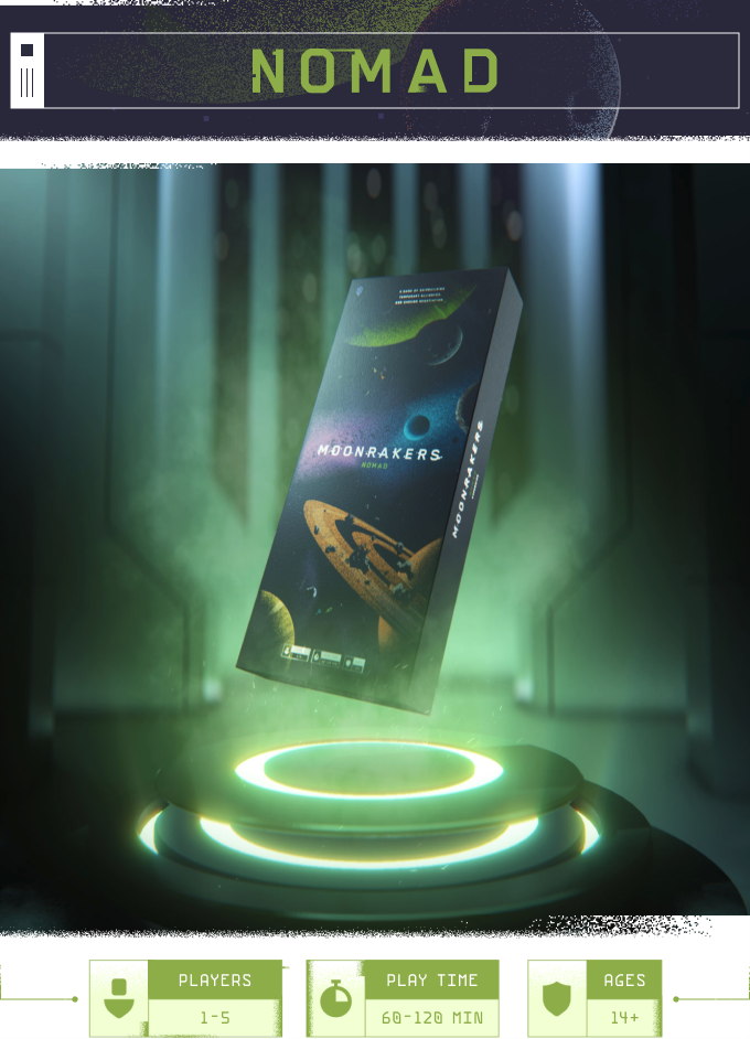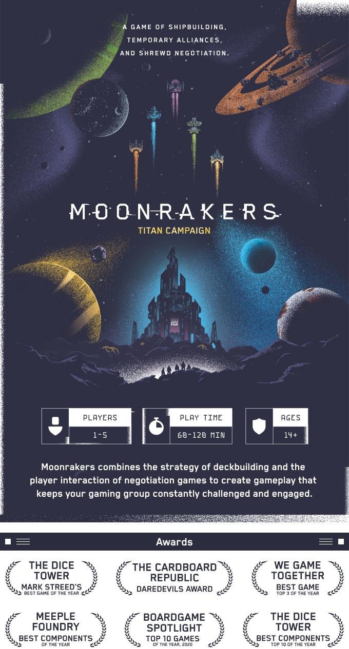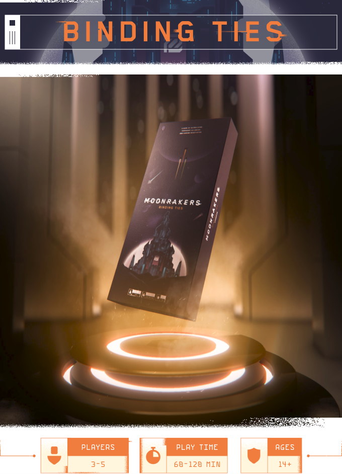 Moonrakers is a game of shipbuilding, temporary alliances, and shrewd negotiation set in a space-faring future. The players form a loose band of mercenaries, but while they are united in name, actual alliances are shaky as players are pitted against each other in the quest to become the new leader of the Moonrakers.