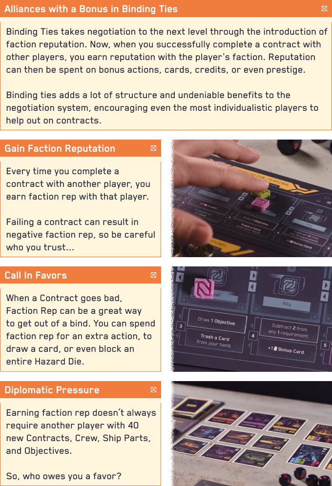 Allies negotiate who will receive the Prestige, Credits, and risk of Hazard from Contracts, but if you don't make your offers enticing enough players may be tempted to betray you! The first player to 10 Prestige wins, but be careful as hazards encountered on Contracts reduce your Prestige!
