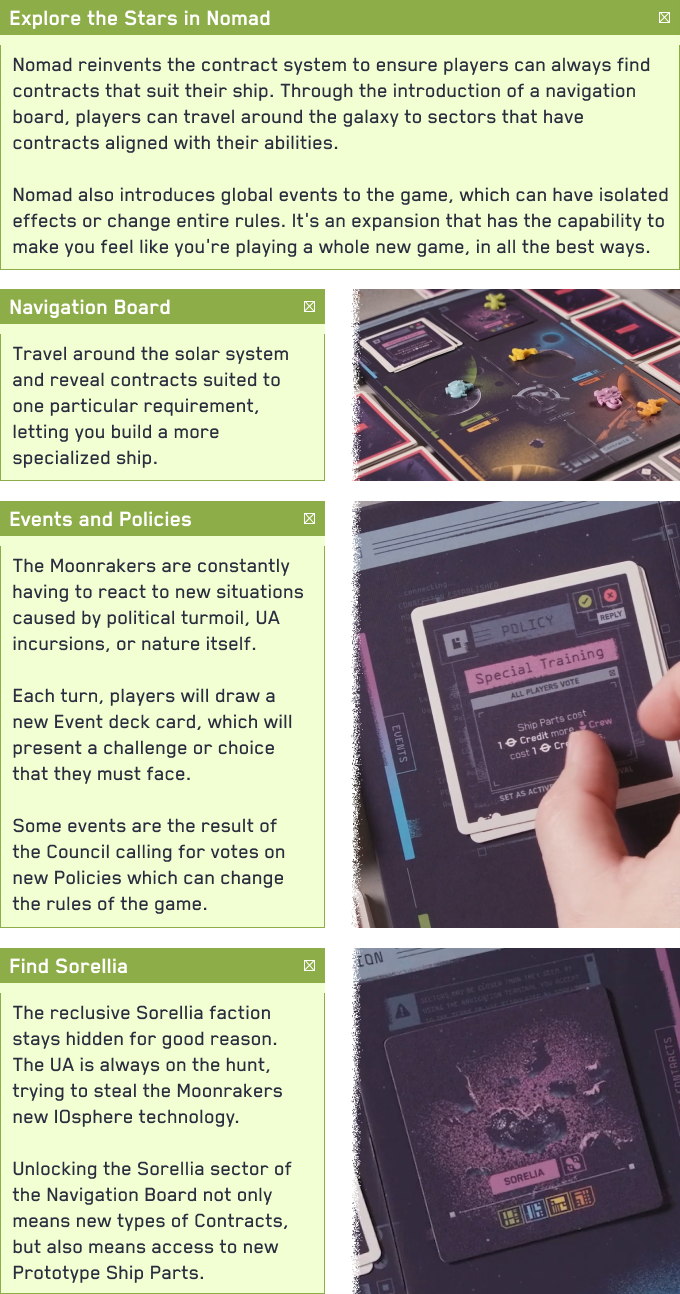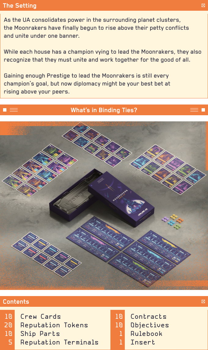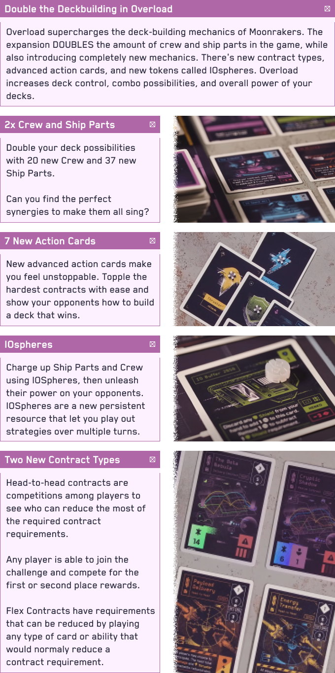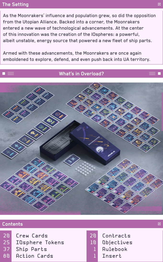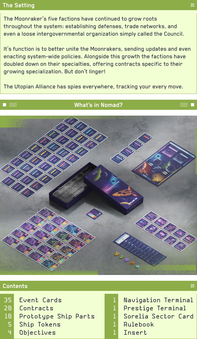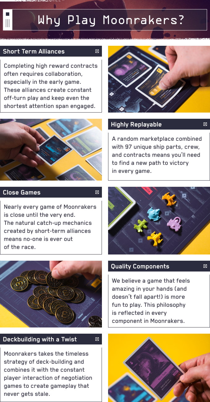 Moonrakers is a deck-building game in which players choose Contracts to attempt alone or with Allies in order to gain Prestige and Credits. After negotiating terms with Allies, players use their decks of Action cards to play Thrusters, Shields, Weapons, Reactors, and Crew to fulfill the requirements on each Contract. Each type of Action card has additional effects such as extra Actions, drawing additional cards, and protecting players from Hazards encountered while attempting Contracts.