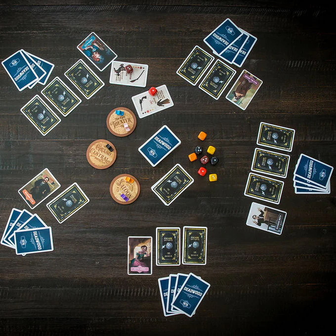 In Deadwood 1876, you use cards from your hand to try to win Safes from other players. Safes contain Badges, Gold, or Showdown Guns. Near the end of the game, players with Badges get extra turns. After the final turn, the team with the most Gold will advance to the Final Showdown. There, teammates will have to fight each other to the death using Showdown Guns. The last person alive is the winner!