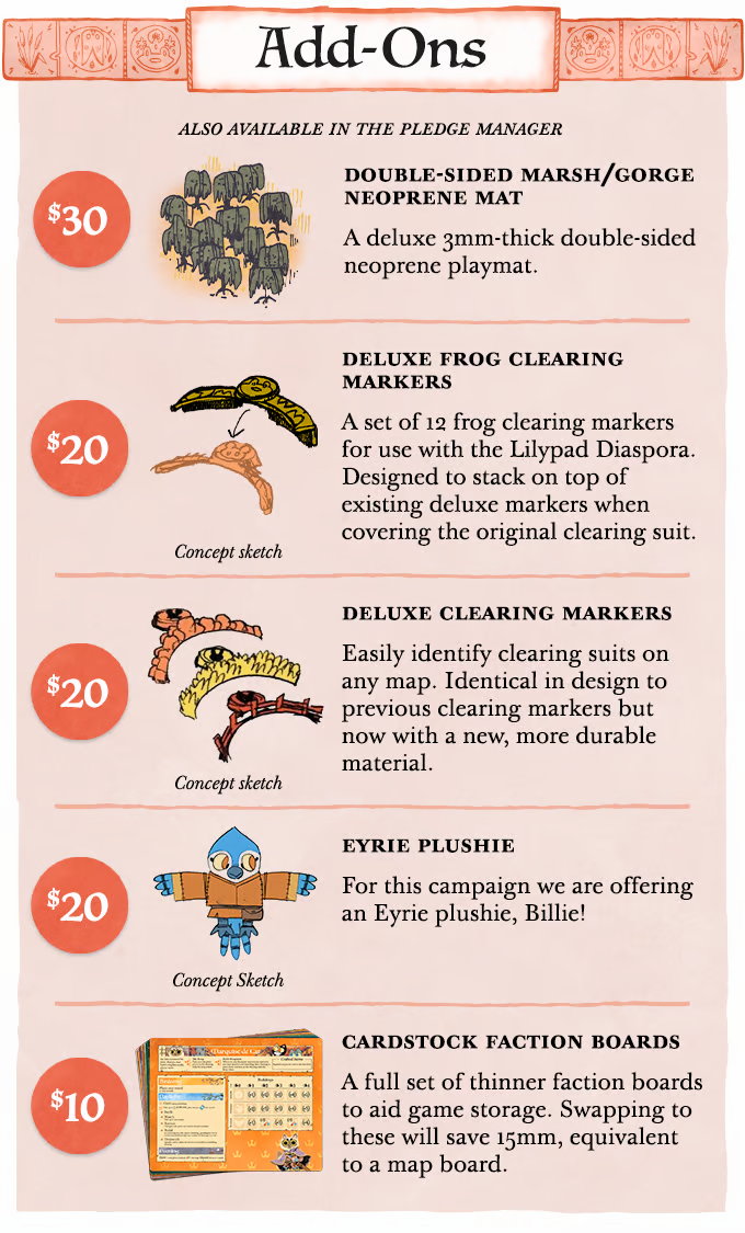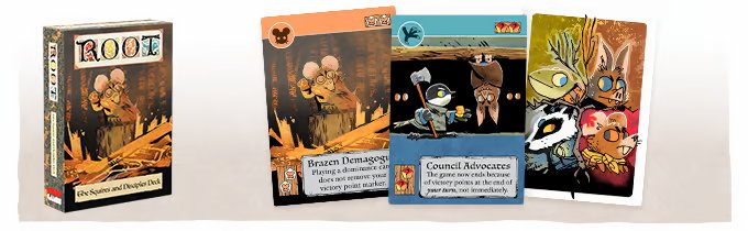 We've been a long time gone, but the hour has come to journey back to Root! Rescue the Woodland from destructive conflict as the Twilight Council, or return to your once and future home as the Lilypad Diaspora. Play on the expandable Marsh map or the tricky Gorge map. And...what's that sound coming from the woods? There's a third faction in the box—the Knaves of the Deepwood!