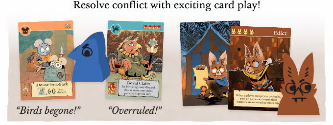 Sickened by the enduring conflict, the Twilight Council hosts assemblies to end the war, bringing together all the Woodland from the lowliest mouse-in-a-sack to the mightiest hawk with a royal claim. The assemblies emphasize political connections over pure numbers of warriors, pushing the factions away from bloody battle and toward heated debate. As the Council progresses in their mission, they can declare edicts to change how the assemblies work, manipulating their enemies’ incentives and actions.