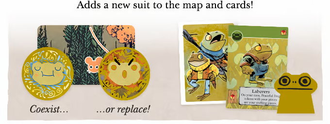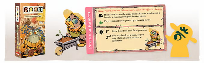 Three new hirelings enter the fray: the Freshwater Refugees, Heartwood Peacemakers, and the neutral Prosperous Farmers. Each comes with a double-sided tarot card and new meeples, adding even more variety to your games of Root.