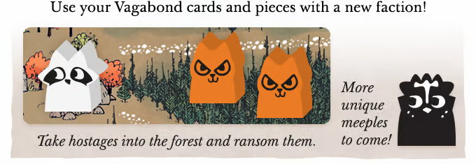 Uses three Vagabond character cards and meeples at once! The Homeland Expansion will include three more unique character cards and meeples, which you can use with this faction or as the Vagabond.