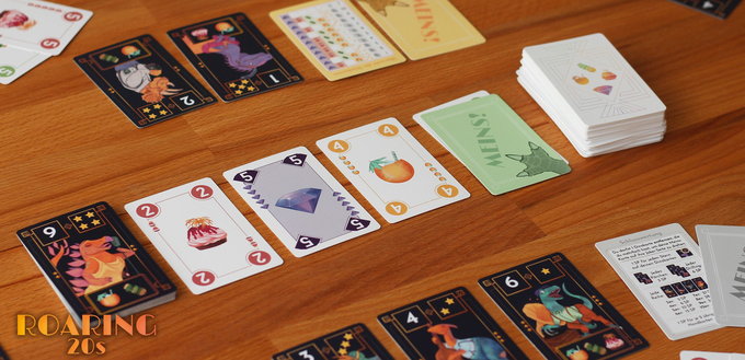 Each round, you bid on a dino or pass. As every dino has different preferences, you need either the right snacks to lure it or splendid gems to bribe it. If you want to jump out of the bidding, place your "Mine!" card on one of the bid cards available; the earlier you pass, the more choices you have. Whoever sticks in the bidding long enough wins the dino, then they decide whether to pay with snacks or gems, with no change if you overpay.