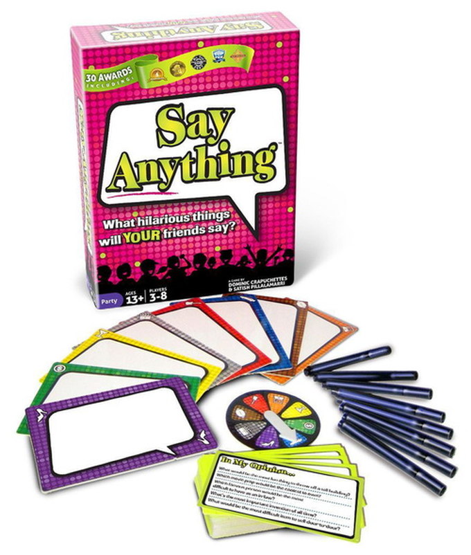 Say Anything is a light-hearted game about what you and your friends think. It gives you the chance to settle questions that have been hotly debated for centuries. For instance, "What is the most overrated band of all time?" or "Which celebrity would be the most fun to hang out with for a day?" So dig deep into your heart or just come up with something witty - this is your chance to Say Anything!