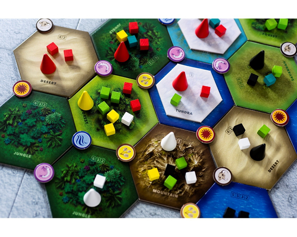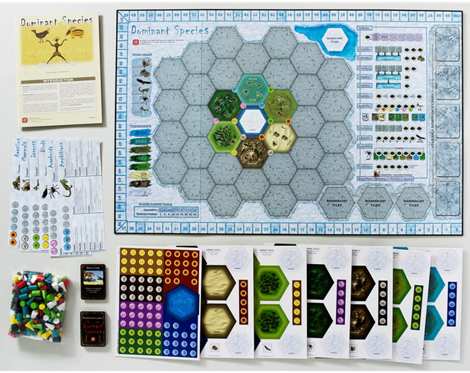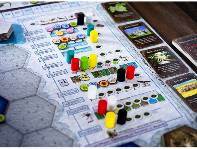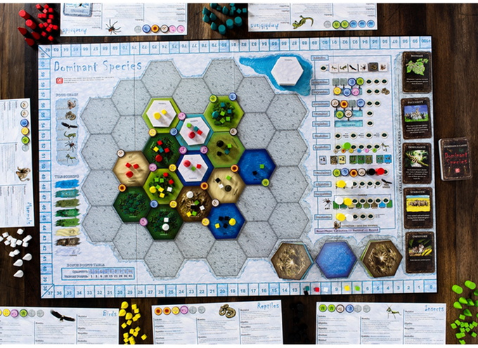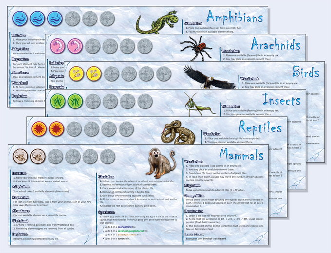 Through wily action pawn placement, players will strive to become dominant on as many different terrain tiles as possible in order to claim powerful card effects. Players will also want to propagate their individual species in order to earn victory points for their particular animal. Players will be aided in these endeavors via speciation, migration, and adaptation actions, among others.