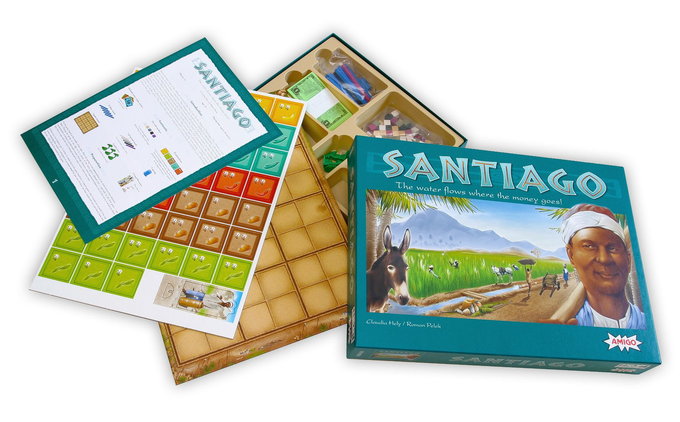 Santiago is about cultivating and watering fields. To accomplish this, a number of tiles denoting various plantation types come into the game each round. The tiles are auctioned off such that each player gets one, and the tiles are then placed onto the game board along with an ownership marker that also indicates how plentiful the tile's yield will be. Whoever bid the lowest in each round gets to be the canal overseer and decides where a canal will be built that round. The other players may make suggestions to help the canal overseer decide, and back up their suggestions with money. The final decision is always wholly up to the overseer, though.