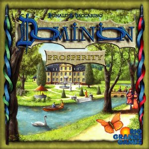 Released in late 2010, Prosperity is the 4th addition to the Dominion game family. It adds 25 new Kingdom cards to Dominion, plus 2 new Basic cards that let players keep building up past Gold and Province. The central theme is wealth; there are treasures with abilities, cards that interact with treasures, and powerful expensive cards.