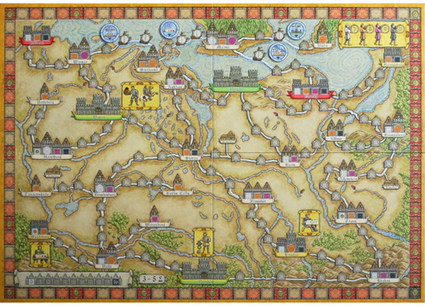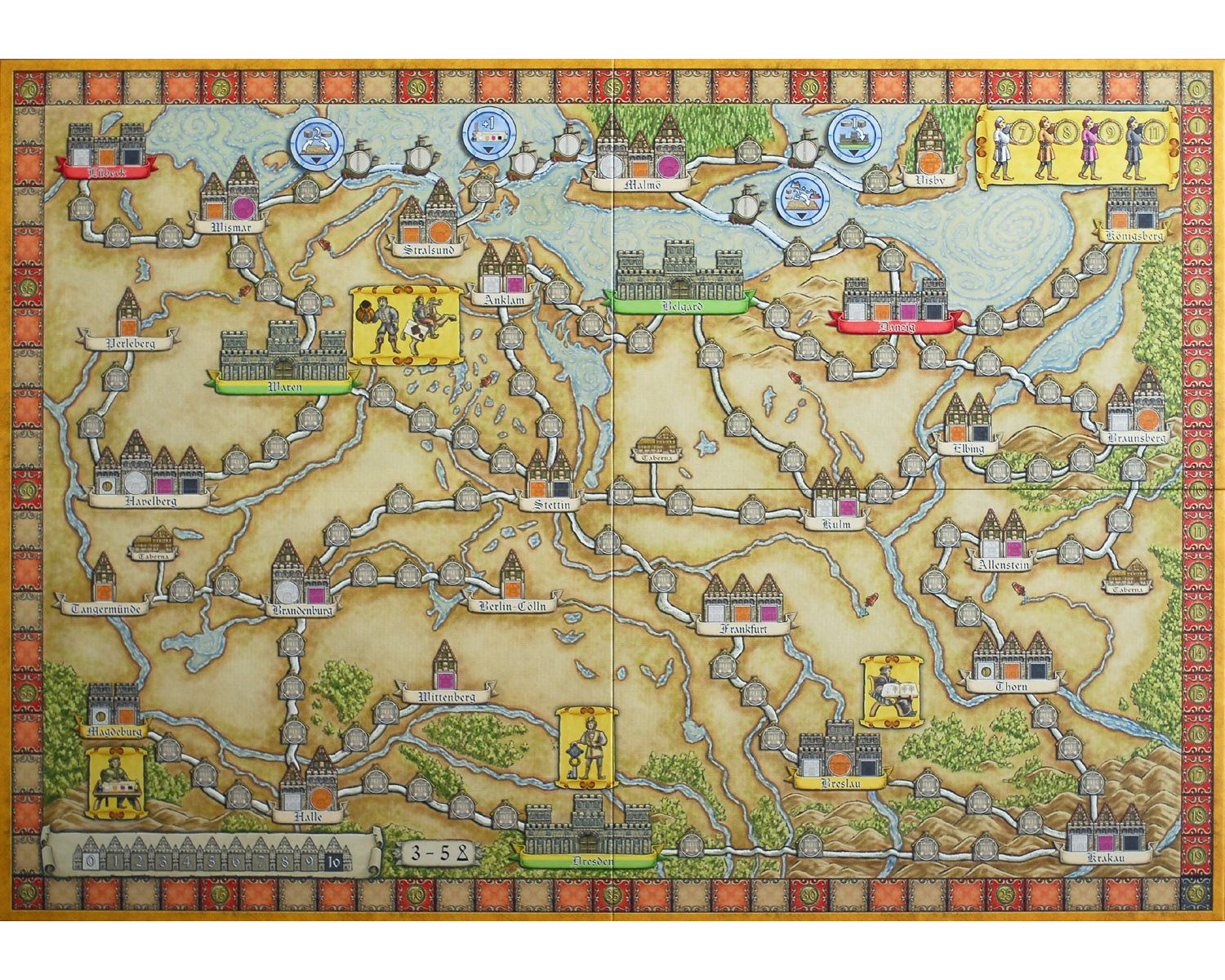 Errata: The rules erroneously mentions the 'Kontor Network', points being given when building the East/West-connection between 'Leipzig' and 'Danzig'. There is no 'Leipzig' on the map. Instead the rules should have stated the city of 'Lübeck'.
