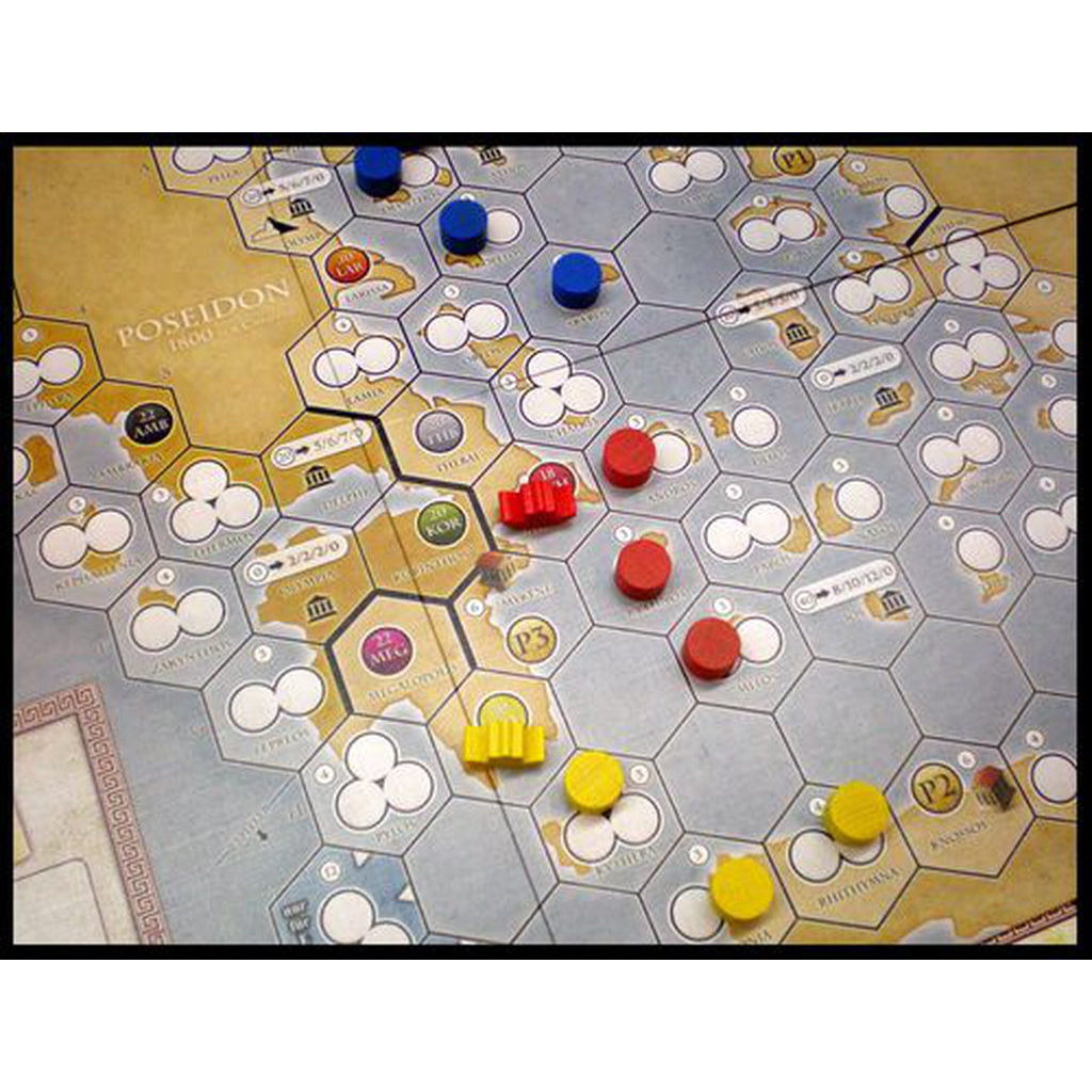 Two to five players act as leaders of different peoples and command them to explore, send out fleets, build trading posts, and generate the highest possible profit. Poseidon contains most of the basics of 18xx games and due to the relatively short running time of two hours is as suitable for 18xx-newbies who want to explore this wonderful world as it is for experienced train gamers.