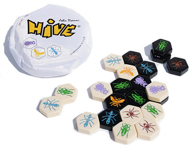 Hive is a boardless, strategic game for 2 players ages 8 and up. The object of the game is to surround your opponent's queen bee while trying to block your opponent from doing the same to your queen bee.