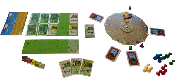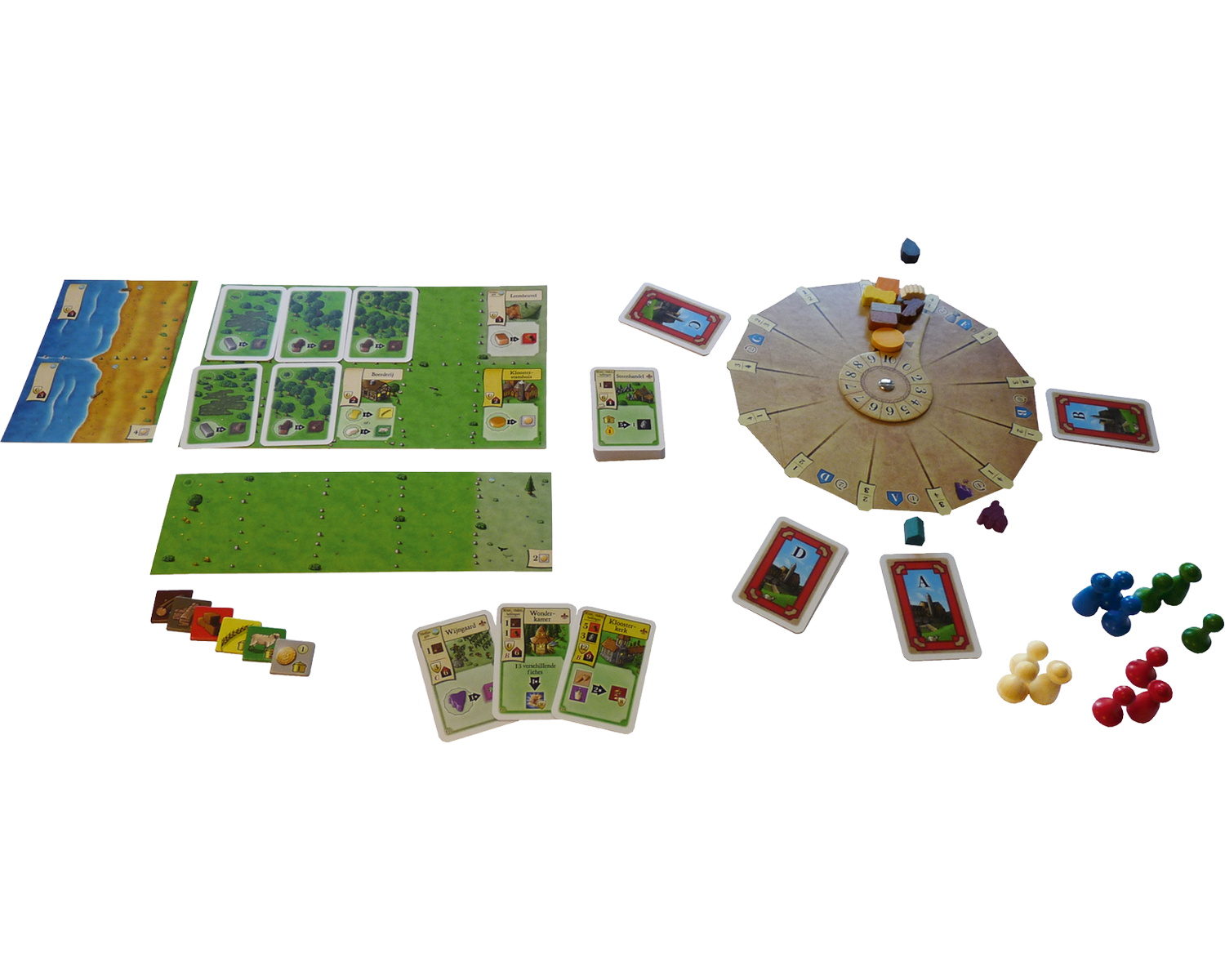 Each player has a personal game board. New buildings enter the game from time to time, and players can construct them on their game boards with the building materials they gather, with some terrain restrictions on what can be built where. Some spaces start with trees or moors on them, as in Agricola: Farmers of the Moor, so they hinder development until a player clears the land, but they provide resources when they are removed. Clever building on your personal game board will impact your final score, amd players can buy additional terrain during the game, if needed.
