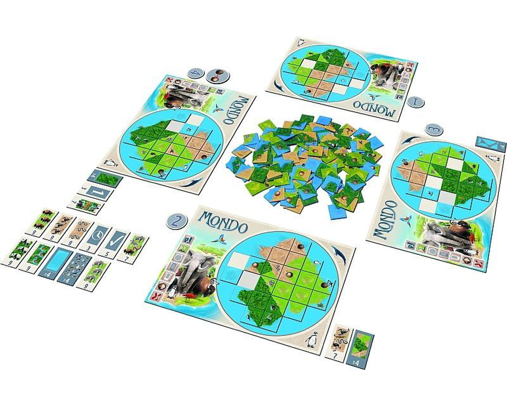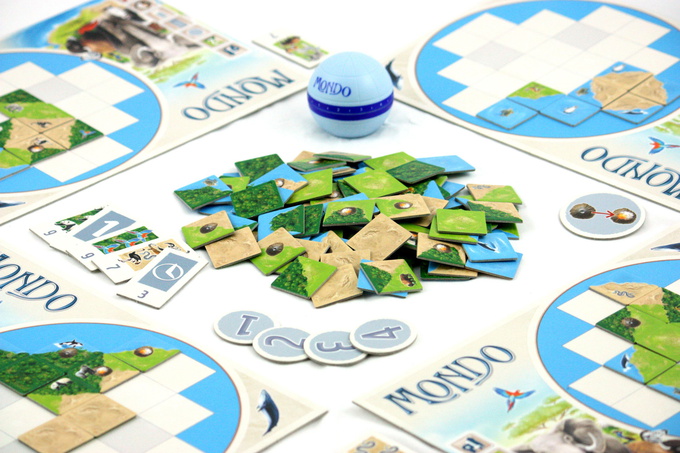 In Mondo, players compete against each other while also racing against the clock. Each player has a small world board with empty spaces on it, and all players simultaneously pick tiles depicting different animals and environments from the middle of the table and place them on their world board, trying to create complete areas of the same environment. A new tile must be placed next to an already placed tile, but the environmental borders don't have to match. (These errors will earn negative points when the board is scored.)