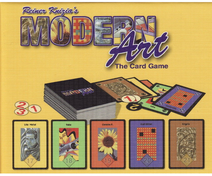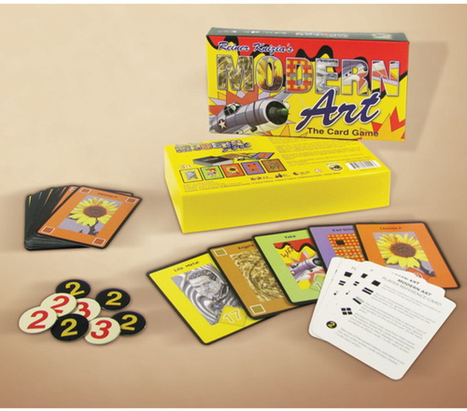 In Modern Art Card Game, also released as Masters Gallery, players are art critics and gallery owners at the same time, trying to pump up the value of certain artists before cashing in their works. The works of five artists are in play. Each player starts with a hand of masterpiece cards, and on a turn you play one on the table to show a stake in the fate of that artist; some masterpiece cards include special actions that allow you to play a second card, draw an extra card, increase the value of a certain artist, or have everyone play a masterpiece card at once.