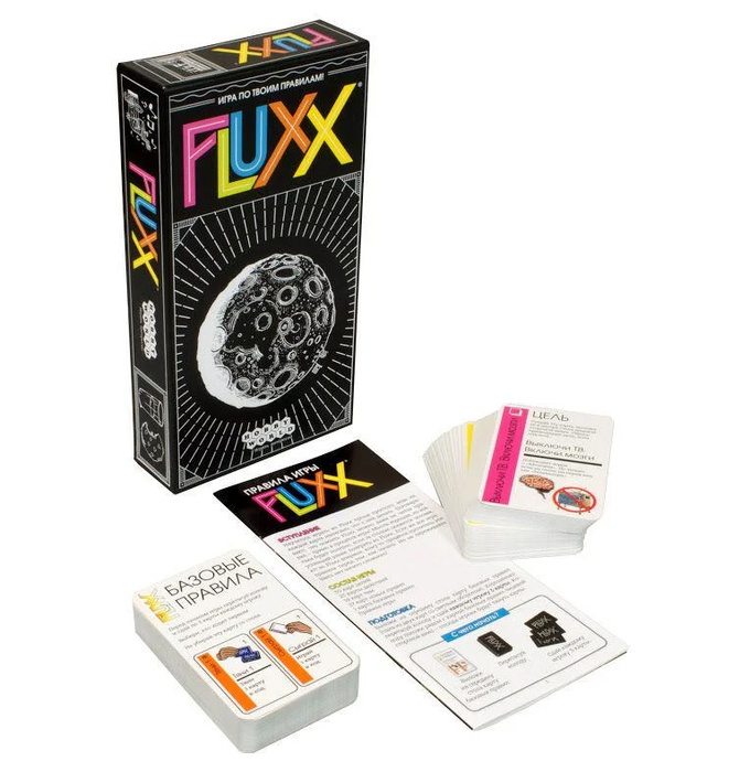 Fluxx is a card game in which the cards themselves determine the current rules of the game. By playing cards, you change numerous aspects of the game: how to draw cards, how to play cards, and even how to win.