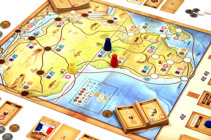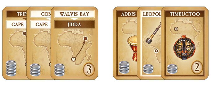 The game board in Africana shows the continent divided in half at the equator, with the cities in the north half colored brown and the cities in the south white. Adventure cards with a brown border can be acquired only in the south and must be delivered to the north, while white-bordered adventure cards take the opposite route. Five expedition cards – each showing the starting and ending location and a reward for completing the expedition – are laid face-up on the game board.