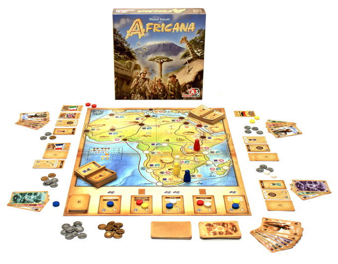 In Africana, players travel through Africa, taking part in expeditions and trying to be the first to reach various destinations. With the money they earn, they can buy adventure cards that earn them precious antiques. Africana features the "Book of Adventures" game system from Schacht's Valdora in which players can acquire cards that are laid out like books, with players "turning the pages" to find the adventure cards they most want.