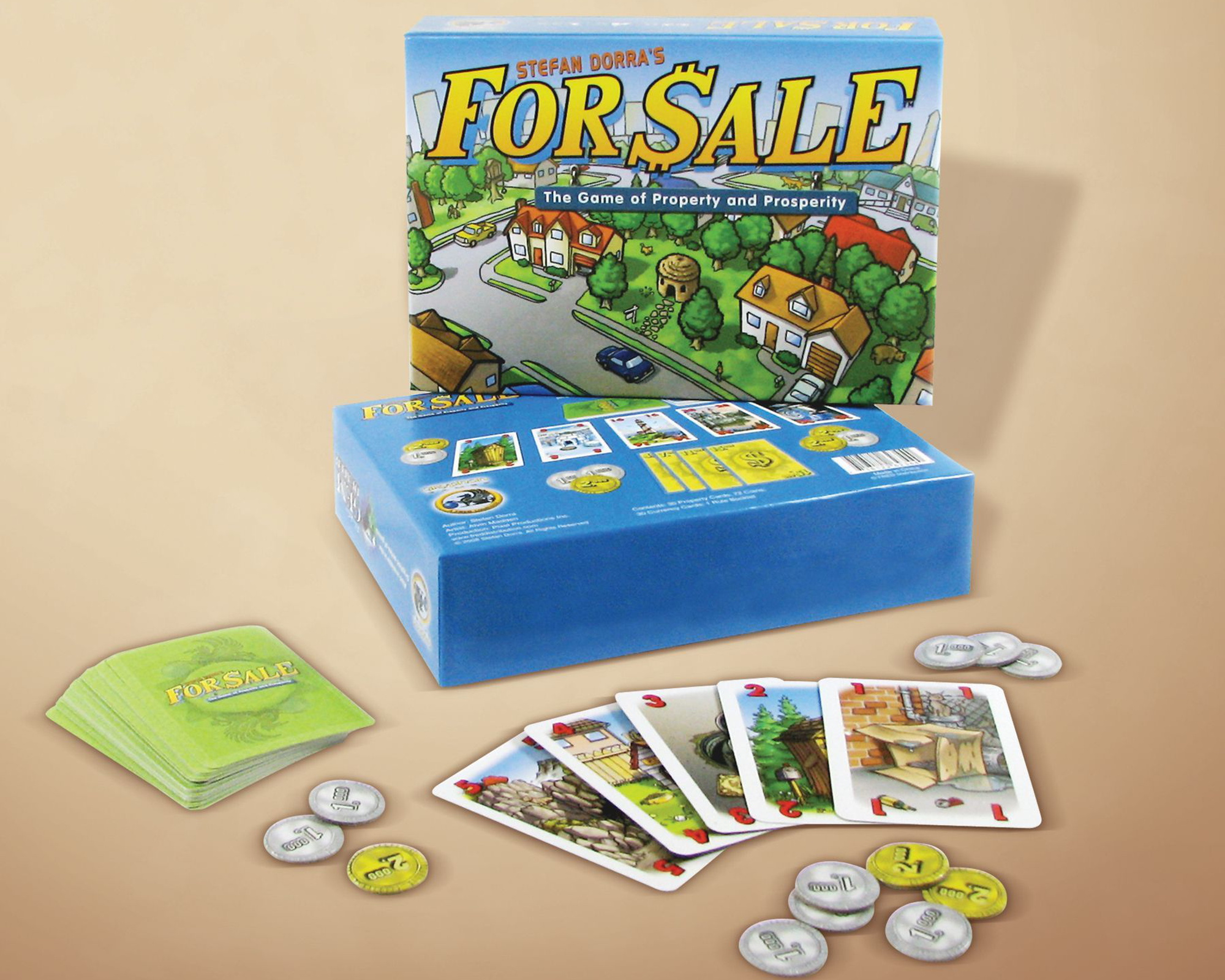 For Sale is a quick, fun game nominally about buying and selling real estate. During the game's two distinct phases, players first bid for several buildings then, after all buildings have been bought, sell the buildings for the greatest profit possible.