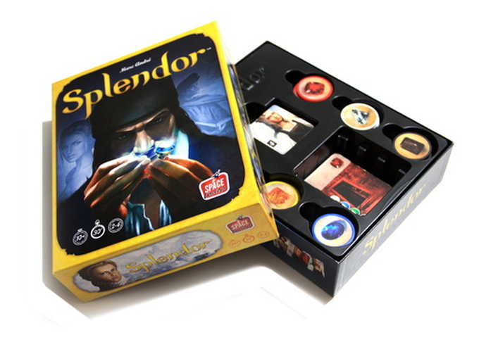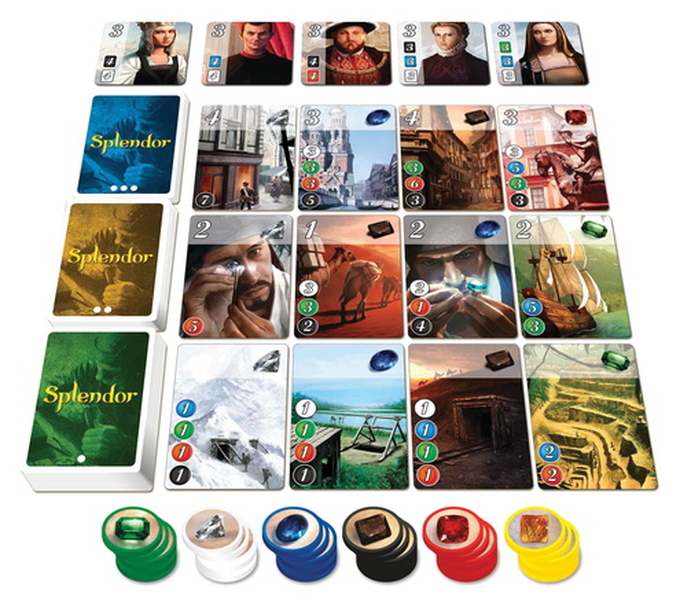Splendor is a game of chip-collecting and card development. Players are merchants of the Renaissance trying to buy gem mines, means of transportation, shops—all in order to acquire the most prestige points. If you're wealthy enough, you might even receive a visit from a noble at some point, which of course will further increase your prestige.