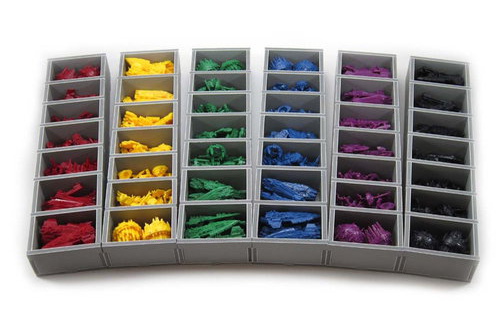 Their is one tray for each colour of player piece. Each tray has individual slots, with ships and other pieces being divided between them as shown.