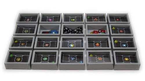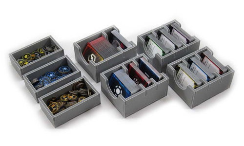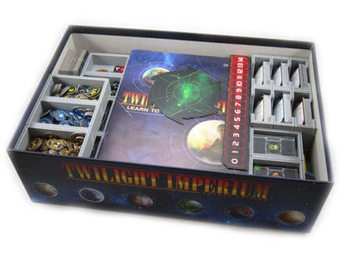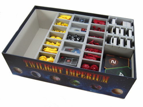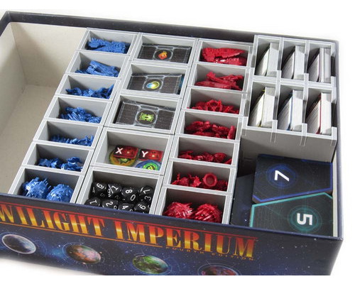 Insert compatible with Twilight Imperium 4th Edition®, and has space provided for future expansions. The design provides both efficient storage and improved game play. Many of the trays can be utilised during the game, and they greatly aid set-up and clear-away times. The rules and boards act as a lid on top of the trays.