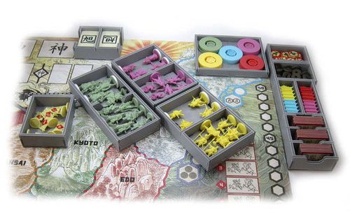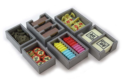 Insert compatible with Rising Sun®, both the retail and the Kickstarter editions. The design provides both efficient storage and improved game play. Many of the trays can be utilised during the game, and they greatly aid set-up and clear-away times. The rules and boards act as a lid on top of the trays.