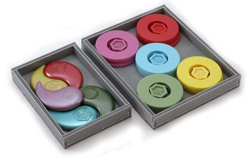 These two trays are for storing the clan alliance markers, and the large monster bases. The hexagon clan markers are stored inside the respective discs.