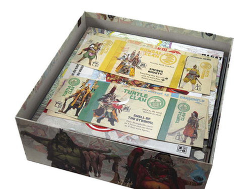 The board, clan screens and rules are stored underneath the clan trays. This gives a flat surface for them to rest on, as well as a lid on the trays below.